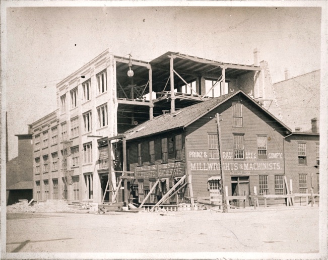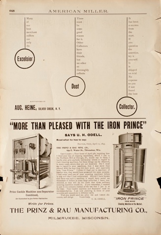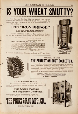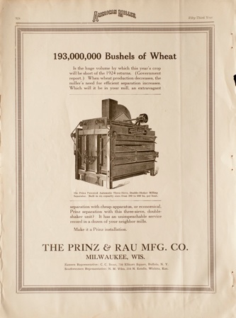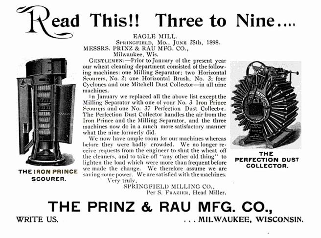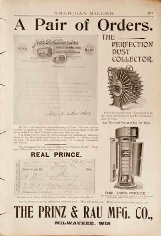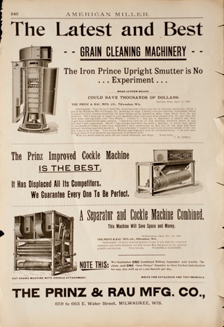 It was established in 1888,the factory and site being purchased from Congressman Henry Smith. Special flour machinery was manufactured, of which the leaders were the Iron Prince scourer, the Prinz Cockle machines, and barley separators, and graders. A change was made in 1895, Mr. Rau selling his interest to Mr. Prinz, the style of the firm, however, remaining unchanged. It was about this time that the firm added to its line of machinery by placing on the market the Perfection dust collector, which took a place at once in the front rank of popularity with millers and has maintained it ever since. The demand for various special machines having outgrown the capacity of the plant, the company decided to rebuild, and March, 1901, ground was broken for the present building, which was completed the following December. The new building is a brick structure and occupies ninety feet on East Water and 180 feet on Knapp street, with a height of four stories. On the lower floor is the office, machine shop, engine and boiler rooms The second floor is devoted to the woodworking department, and here the Perfection dust collectors are put together, as also the receiving and milling separators. The entire third floor is given over to the building of the Iron Prince scourers, while the top floor is used as a storage room for lumber and patterns and also as a stockroom.
